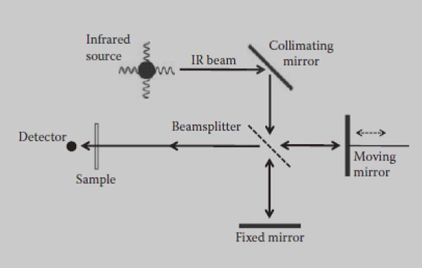 IR-1600傅立葉變換紅外光譜儀是利用干涉儀干涉調(diào)頻的工作原理,把光源發(fā)出的光經(jīng)邁克爾遜干涉儀變成干涉光,再讓干涉光照射樣品,接收器接收到帶有樣品信息的干涉光,再由計算機軟件經(jīng)傅立葉變換即可獲得樣品的光譜圖。原理圖如下: